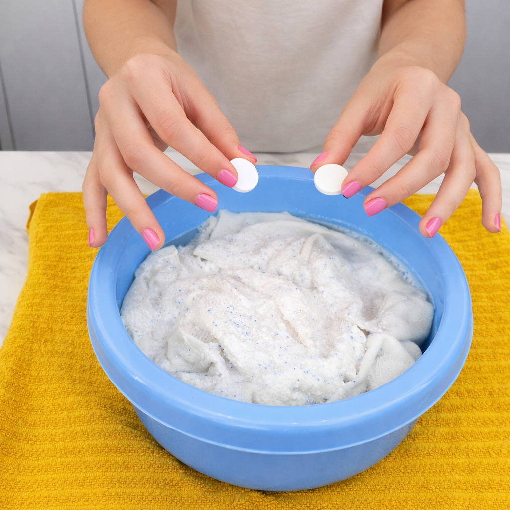 Smíchejte 2 litry horké vody, 1 hrnek octa, 3 lžíce pracího prášku a přidejte 2 tablety na zubní protézy. Prádlo namočte na cca 1 hodinu a poté vyperte běžným způsobem. Výsledek vás překvapí! ✨