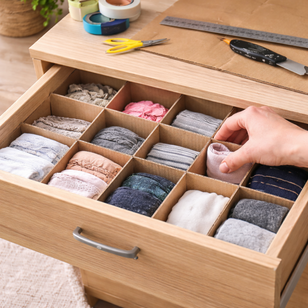Zapomeňte na drahé plastové organizéry. Stačí vám pravítko, nůž a karton. Naměřte si délku a šířku zásuvky, vyřežte pásy kartonu a udělejte do nich zářezy, aby do sebe zapadly jako mřížka. Ideální na spodní prádlo nebo příbory! 🧦