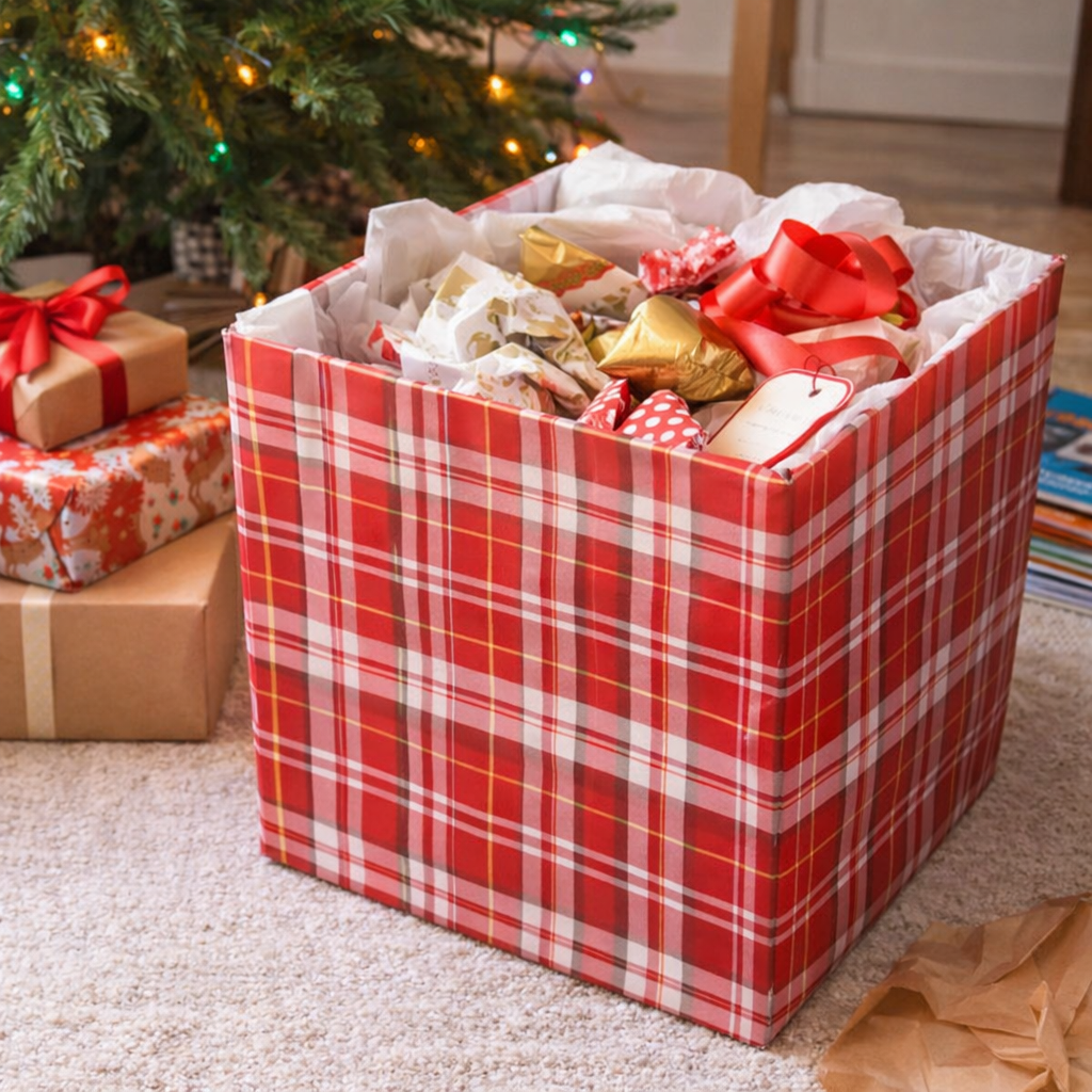 Vezměte větší krabici a polepte ji pěkným balicím papírem nebo látkou. Skvěle poslouží jako vánoční koš na rozbalené papíry pod stromečkem nebo jako dočasný odpadkový koš v pracovně. 🎁