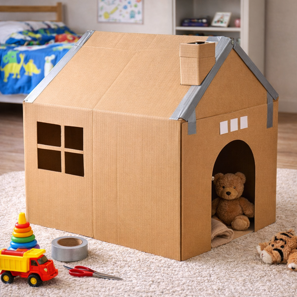 Děti milují schovávačky v krabicích. Spojením dvou velkých krabic pomocí lepicí pásky vytvoříte základ. Pokud jednu stranu proříznete tak, aby se dala složit, můžete domeček po hraní jednoduše schovat pod postel. 🏠