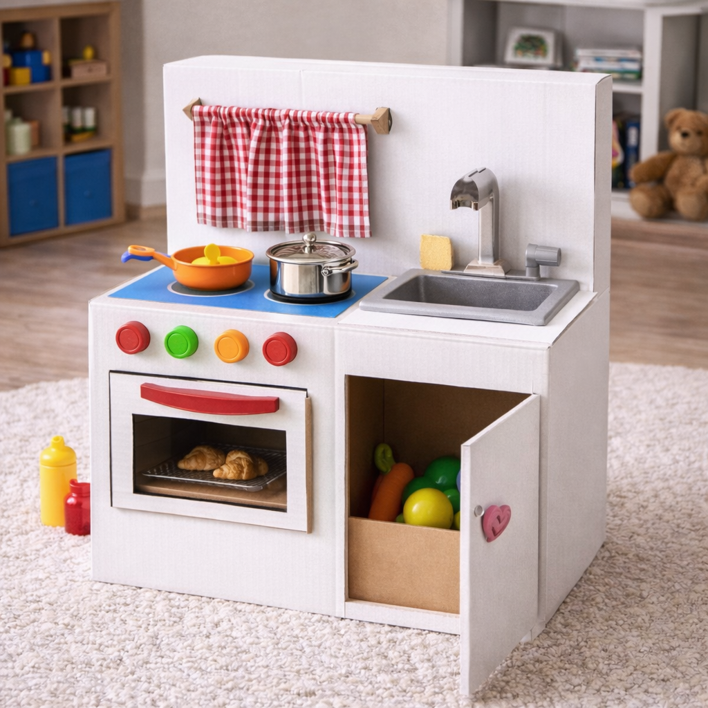 Trocha barvy, pár starých víček od lahví jako knoflíky u sporáku a máte dětskou kuchyňku, která nestojí ani korunu, a přitom zabaví na celé hodiny. 🍳
