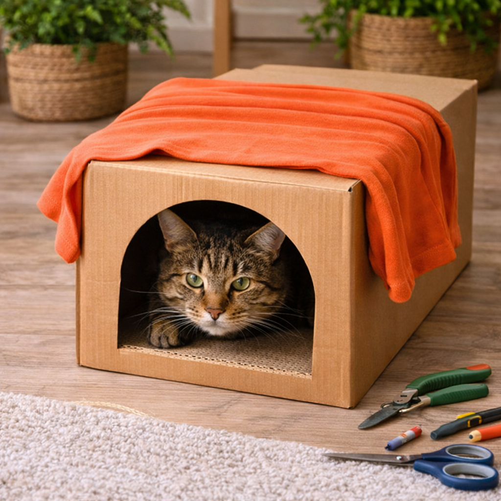 Navlékněte staré tričko na krabici tak, aby otvor pro krk sloužil jako vchod. Rukávy zastrčte dovnitř. Vaše kočka si tento „stan“ okamžitě zamiluje! 🐱