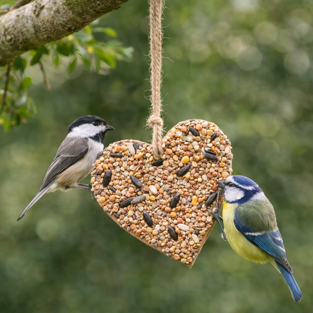 Vystřihněte z kartonu tvar (třeba srdce), potřete ho arašídovým máslem a obalte v ptačím zobu. Provlékněte provázek a pověste na strom. Ptáčci budou mít hostinu a karton se časem sám rozloží. 🐦