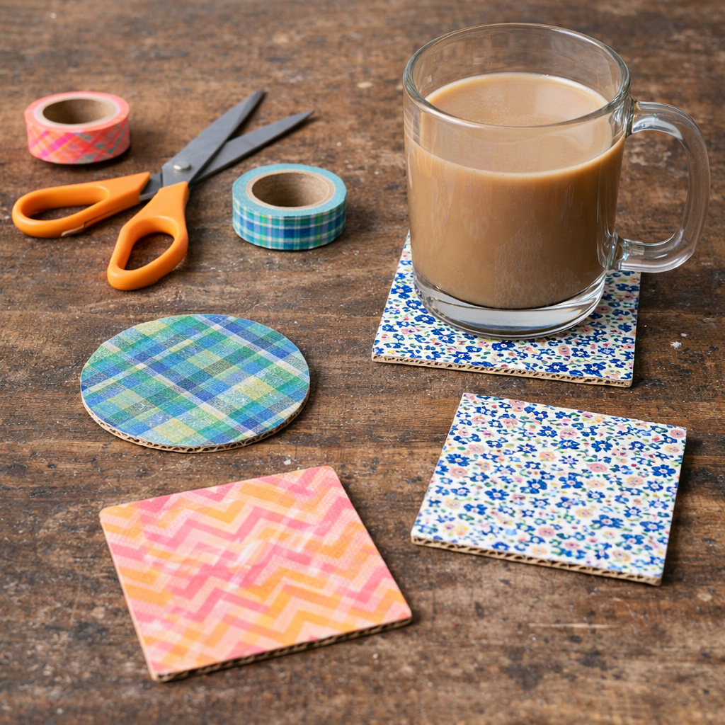 Vystřihněte z kartonu čtverce nebo kruhy a polepte je ozdobnou páskou (washi tape). Máte originální podložky pod pití, které vypadají skvěle. ☕