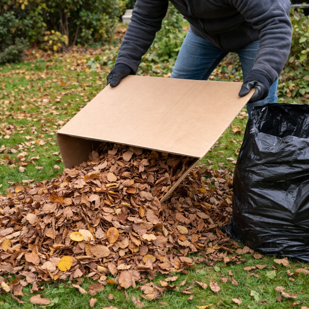 Velký kus kartonu funguje jako obří lopata. Jednoduše s ním nahrnete listí na hromadu nebo do pytle mnohem rychleji než s malým nářadím. 🍂