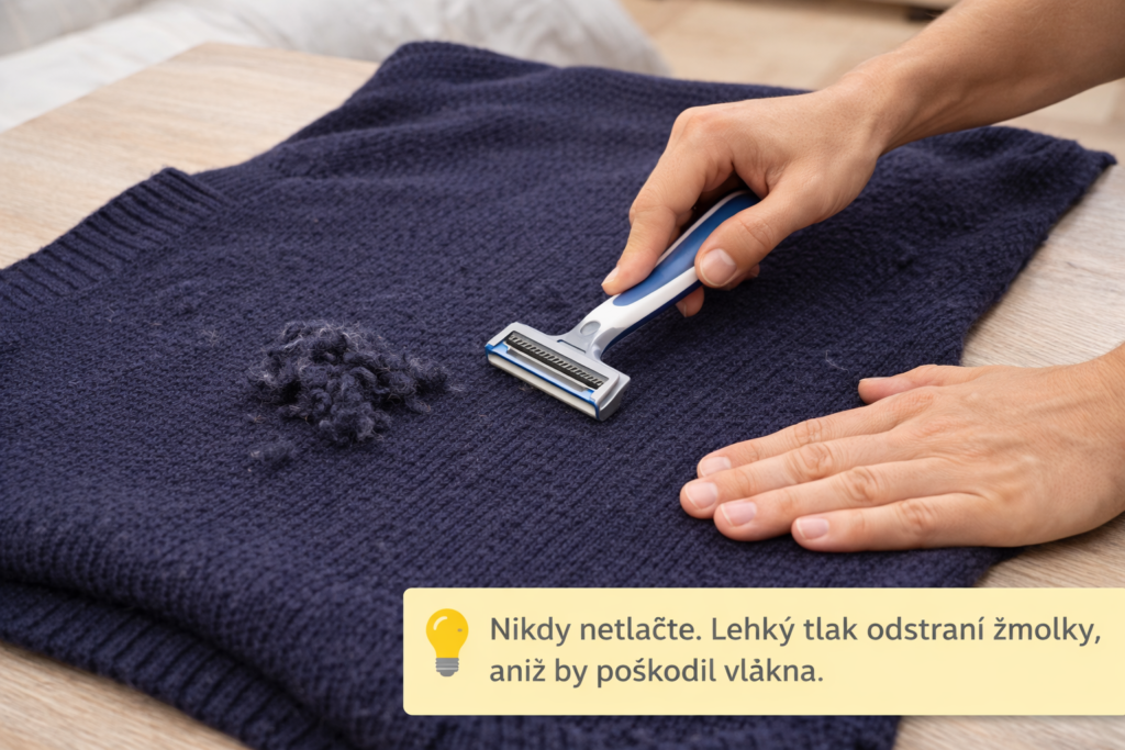 💡 Tip: Nikdy netlačte. Lehký tlak odstraní žmolky, aniž by poškodil vlákna.