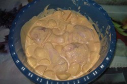 Připravíme si marinádu smícháním všech surovin. Do marinády vložíme naporcované kuře, nakrájené brambory a odložíme na pár hodin do chladničky.