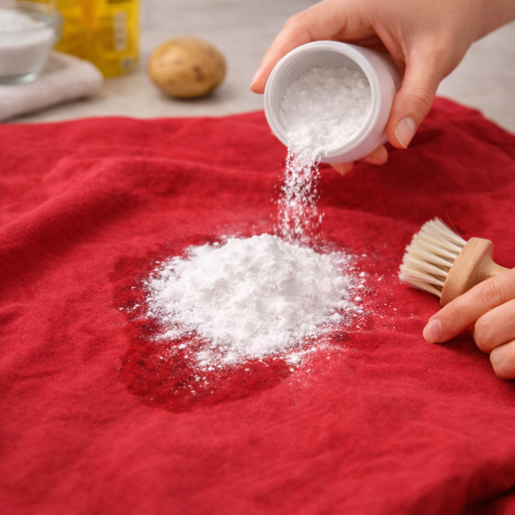 Možná jste už slyšeli o tření skvrny syrovou bramborou. Ve skutečnosti je ale mnohem účinnější použít čistý škrob – tedy bramborový škrob nebo kukuřičnou mouku. Tyto jemné prášky mají vysokou absorpční schopnost a dokážou nasát mastnotu dříve, než se pevně spojí s vlákny látky.