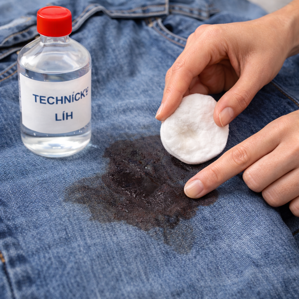 5️⃣ Masťové skvrny na džínách? Technický líh jako silnější řešení 🧴