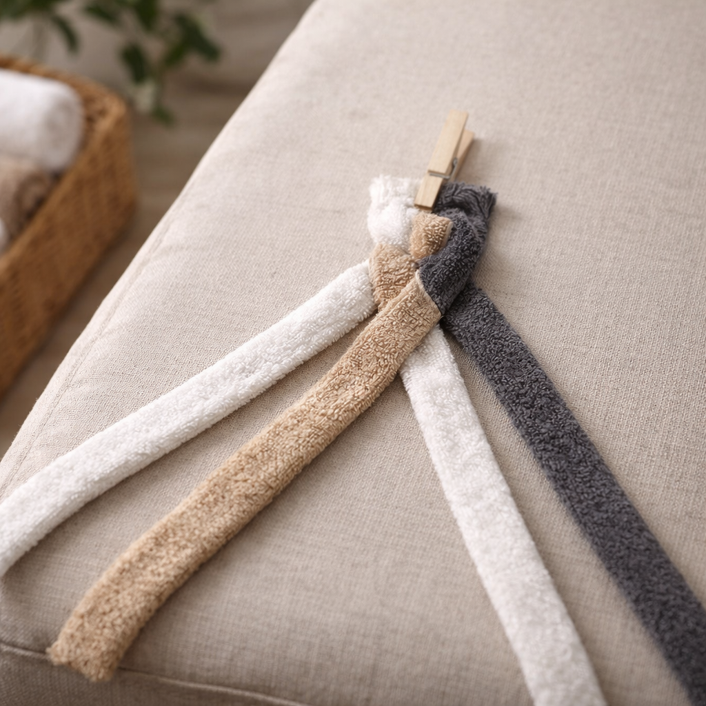 Než nastříháte celý ručník, zkuste nejprve 2–3 proužky a otestujte, zda se vám s nimi dobře pracuje.