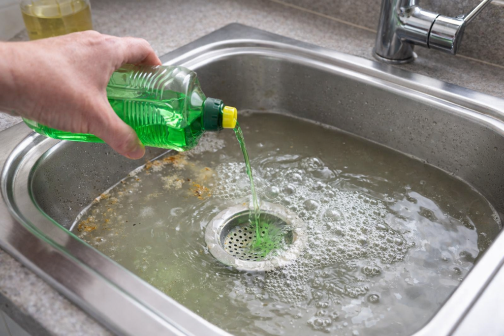 Aplikace: Nalijte přibližně polovinu lahve běžného saponátu na nádobí přímo do odpadu.