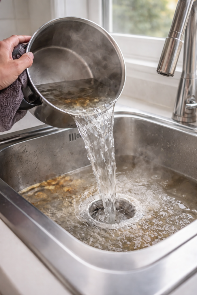 Horká sprcha: Poté odpad propláchněte velkým množstvím horké vody. Pokud máte plastové potrubí, voda by neměla být úplně vařící, aby nedošlo k jeho deformaci.
